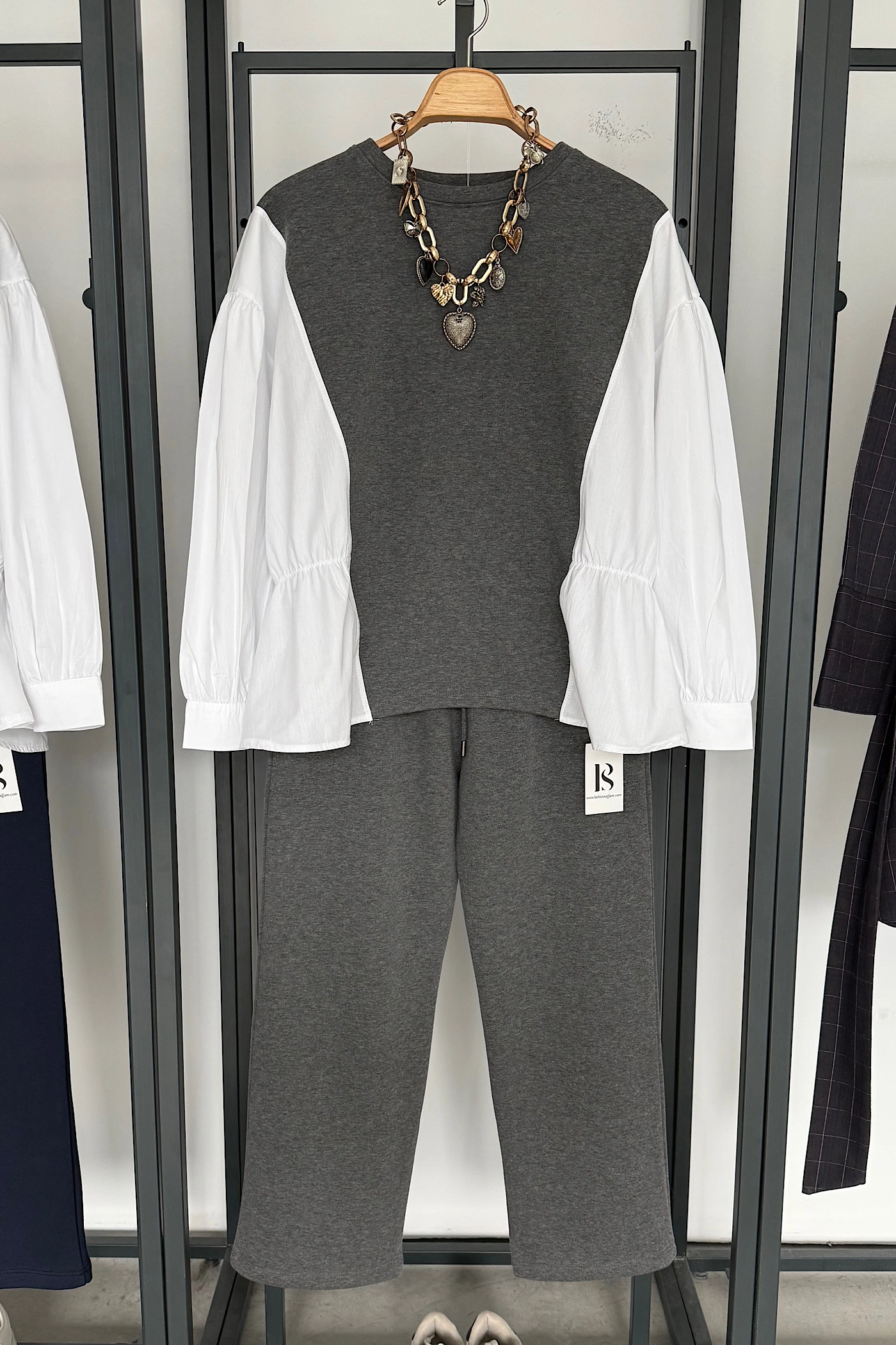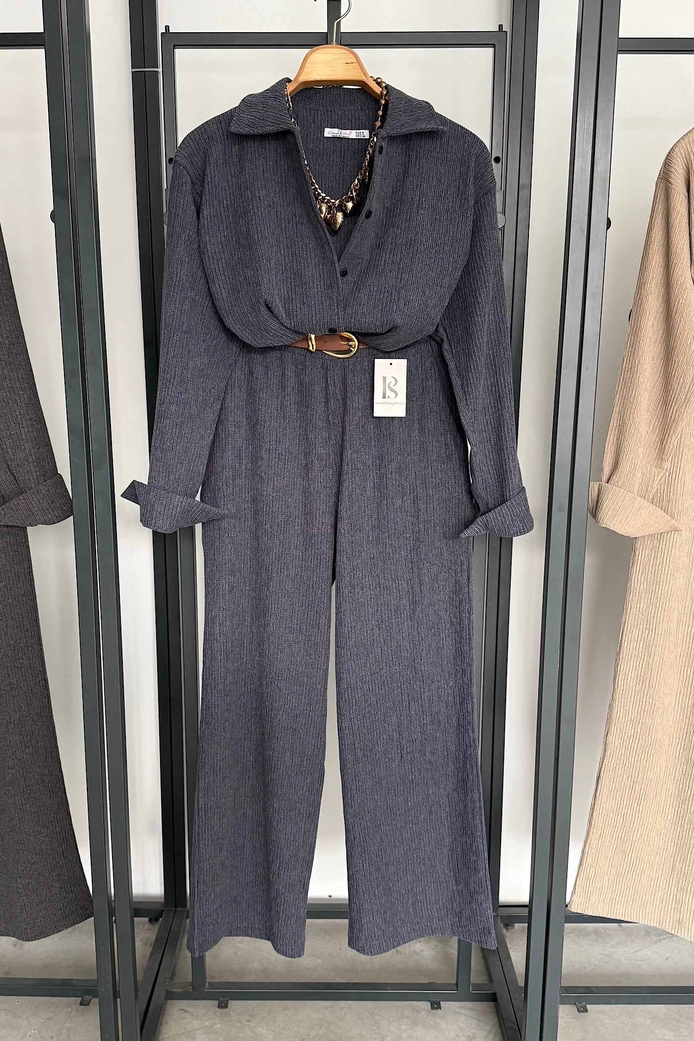 Charcoal Satin Set with Oversized Belt Detail
