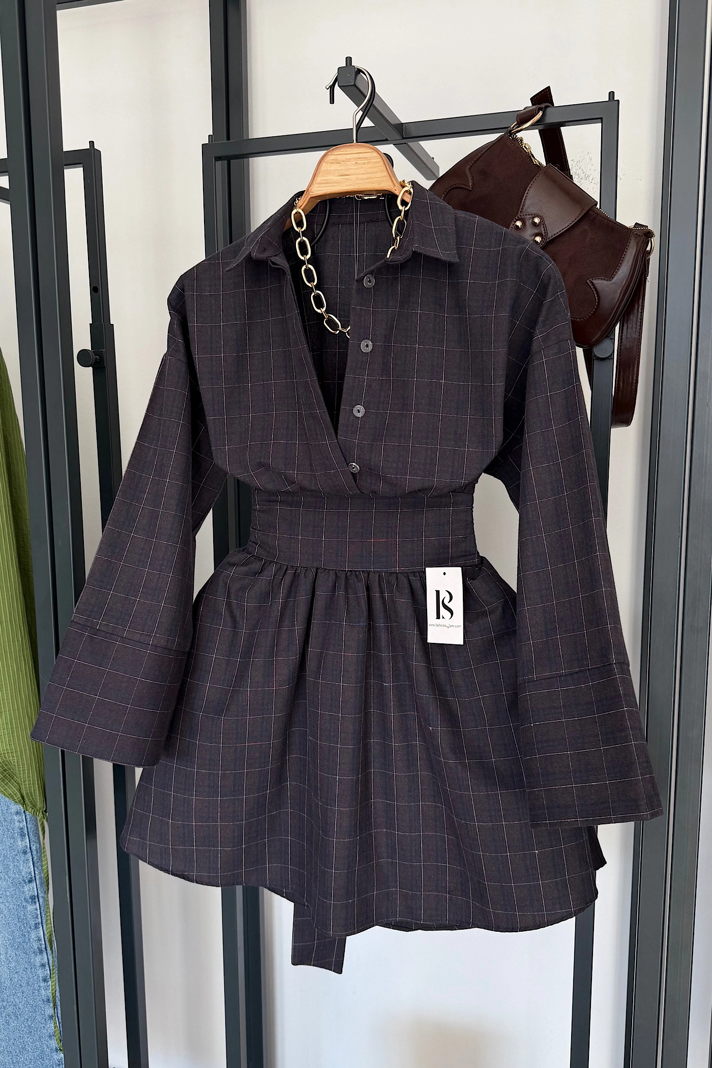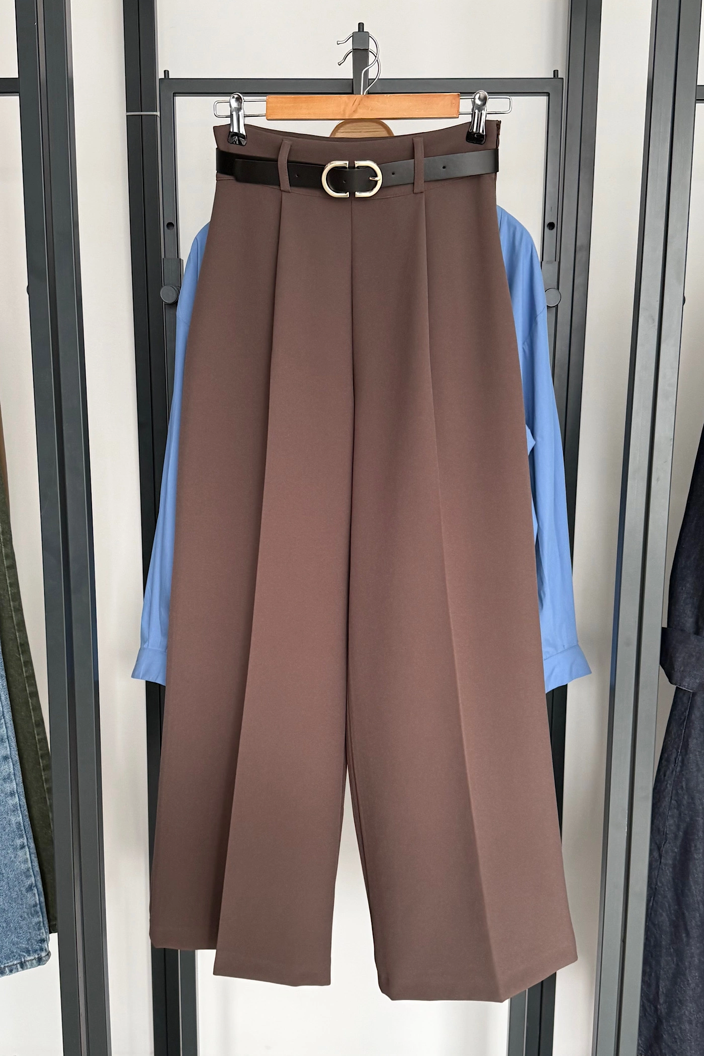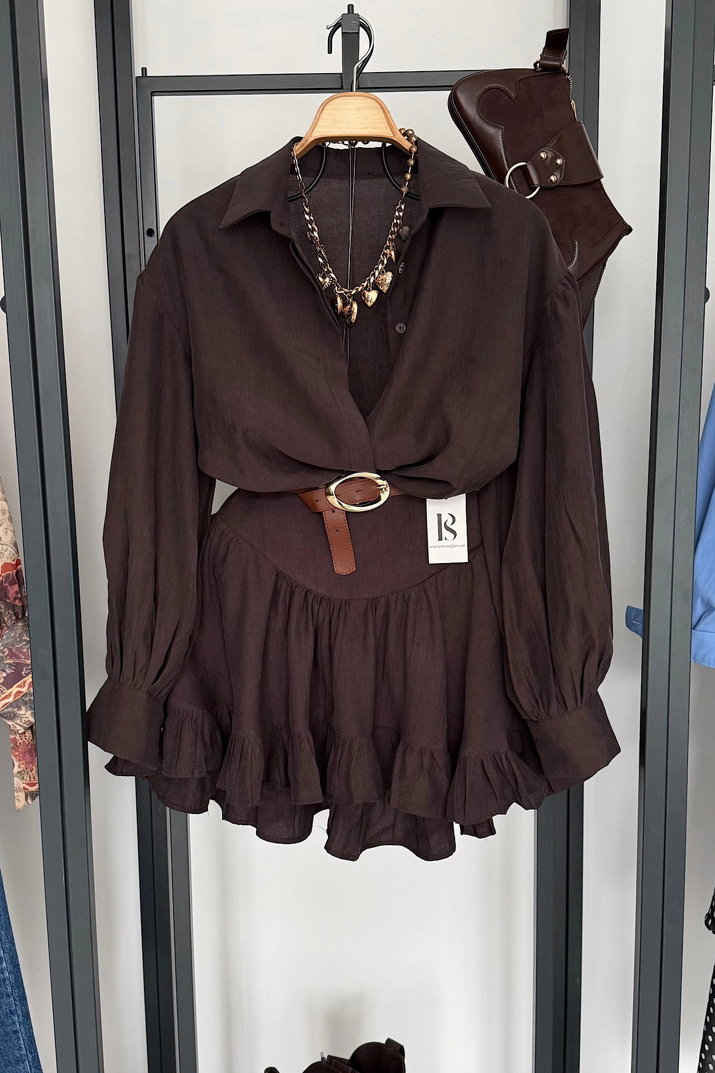 Brown Satin Set with Oversized Belt Detail
