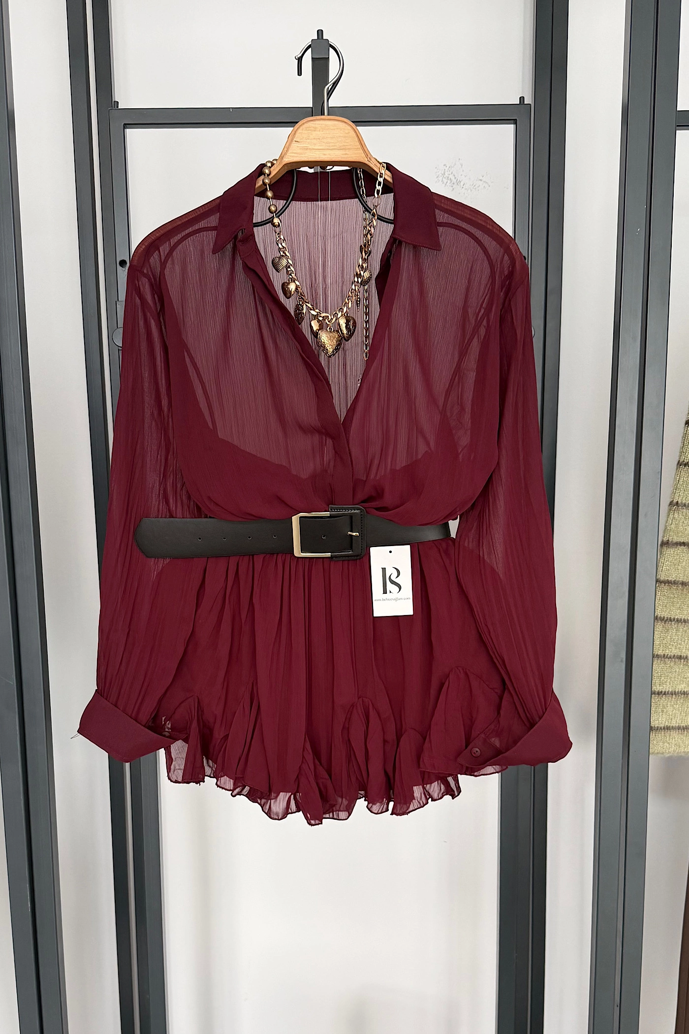 Burgundy Satin Set with Oversized Belt Detail