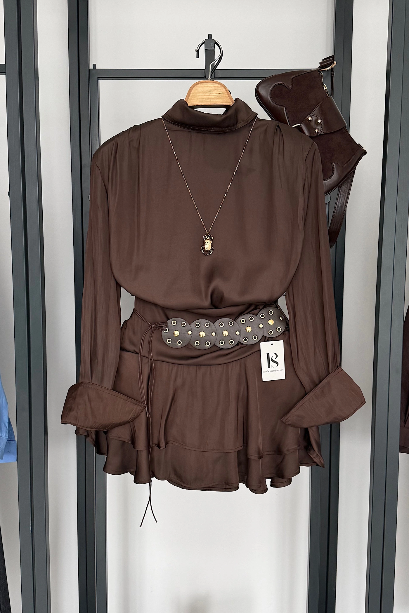 Brown Satin Set with Oversized Belt Detail