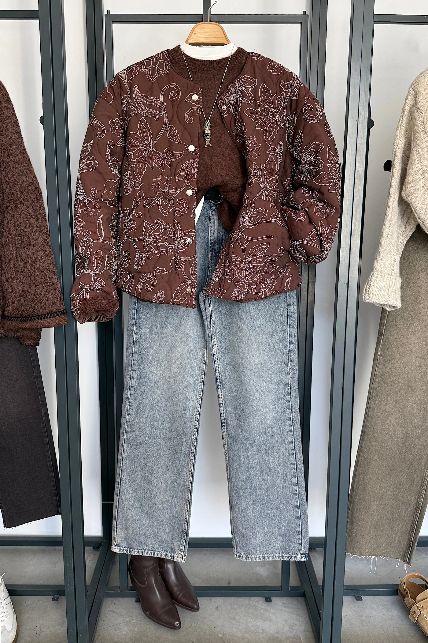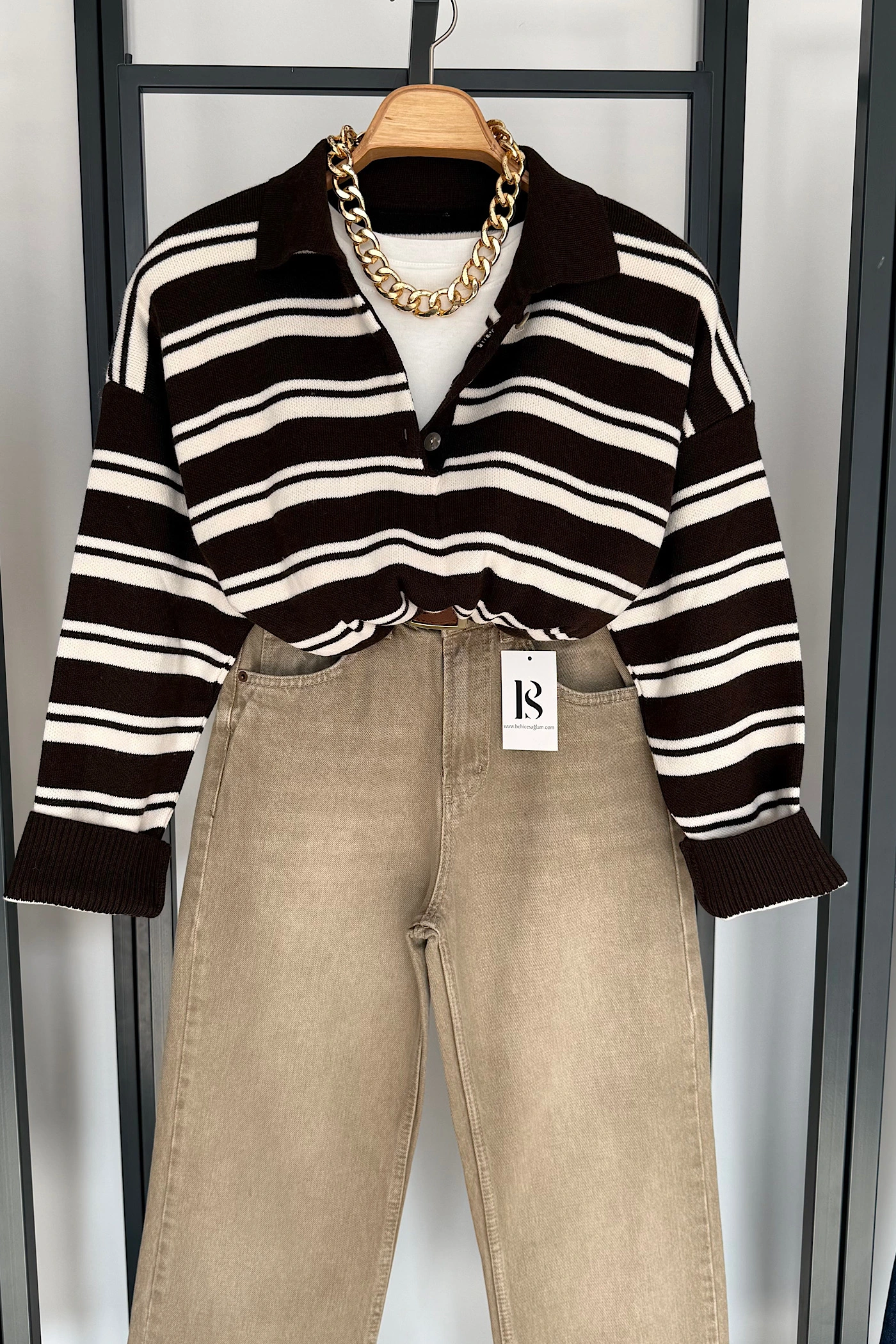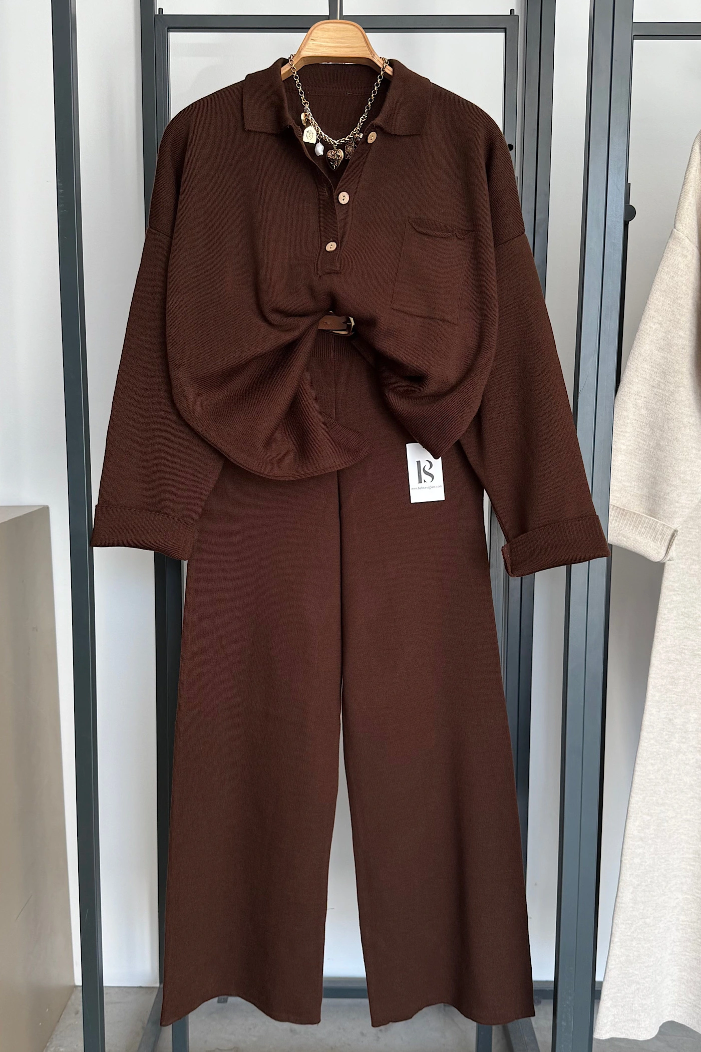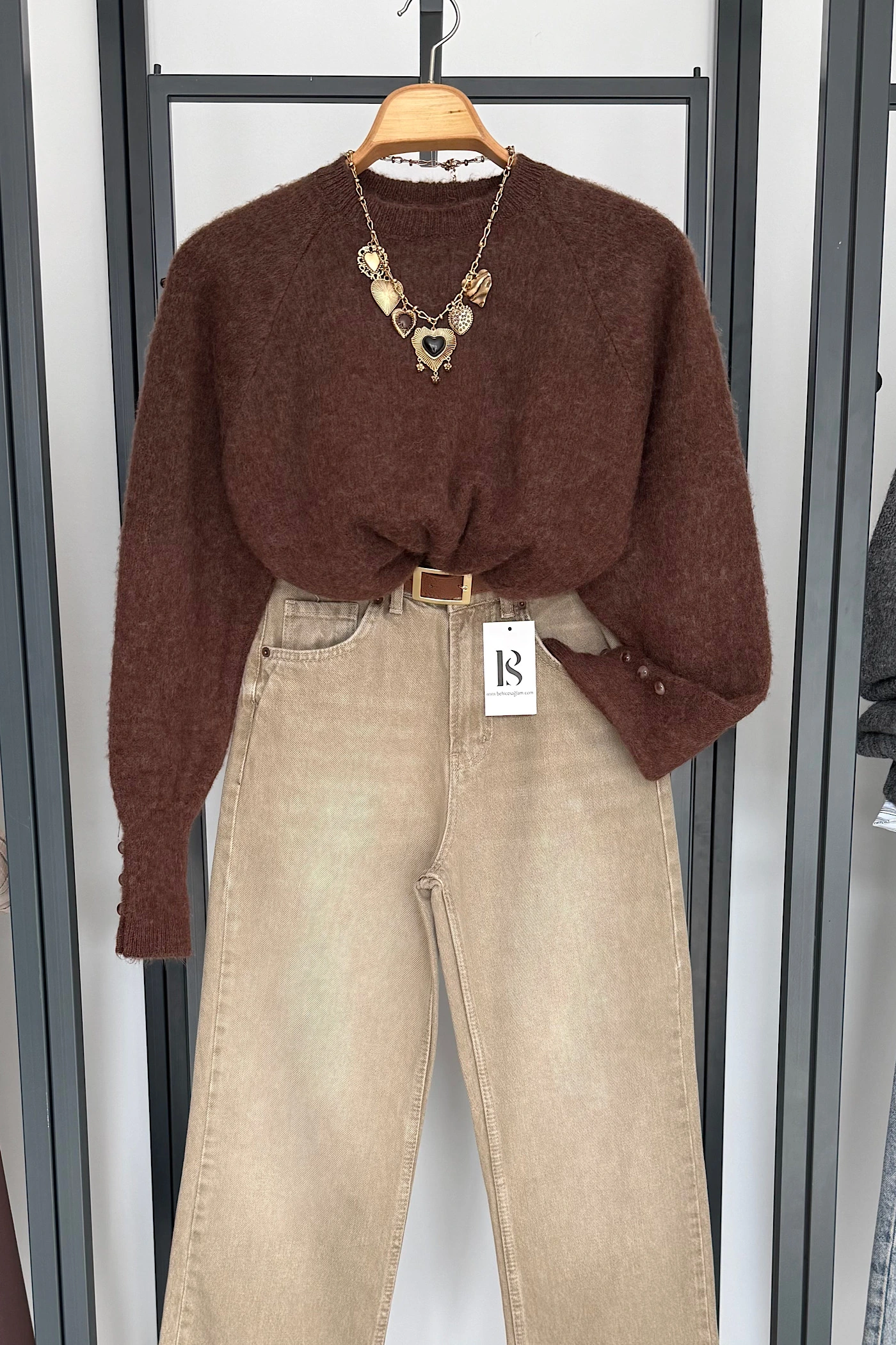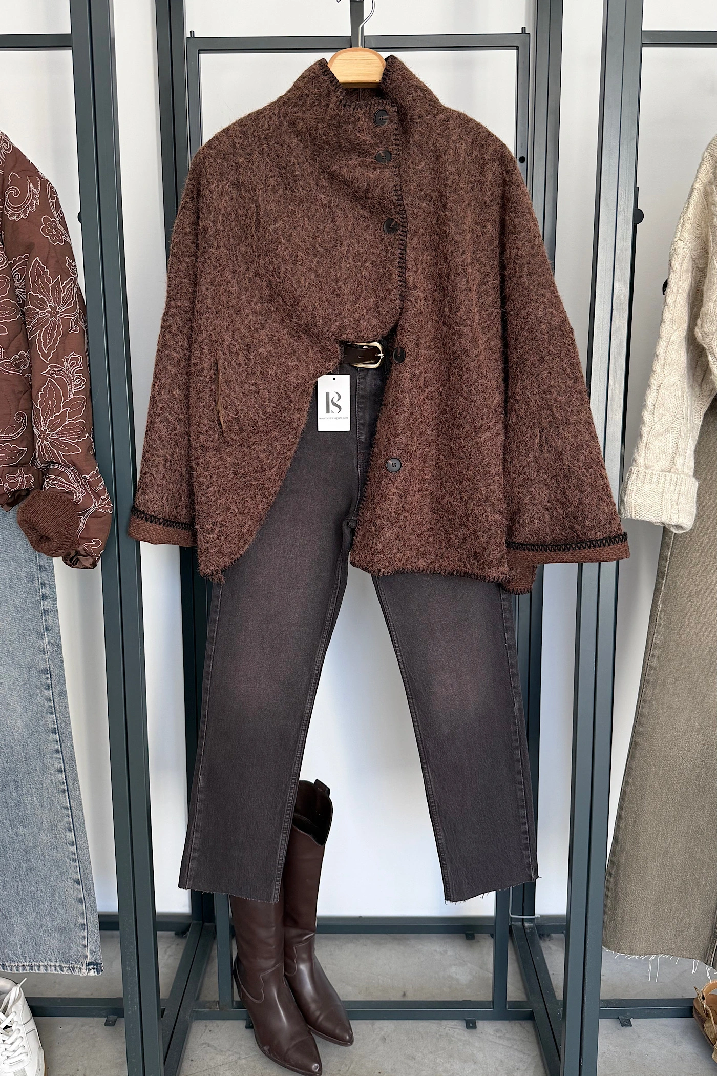 Patterned Brushed Buttoned Knit Cardigan Brown