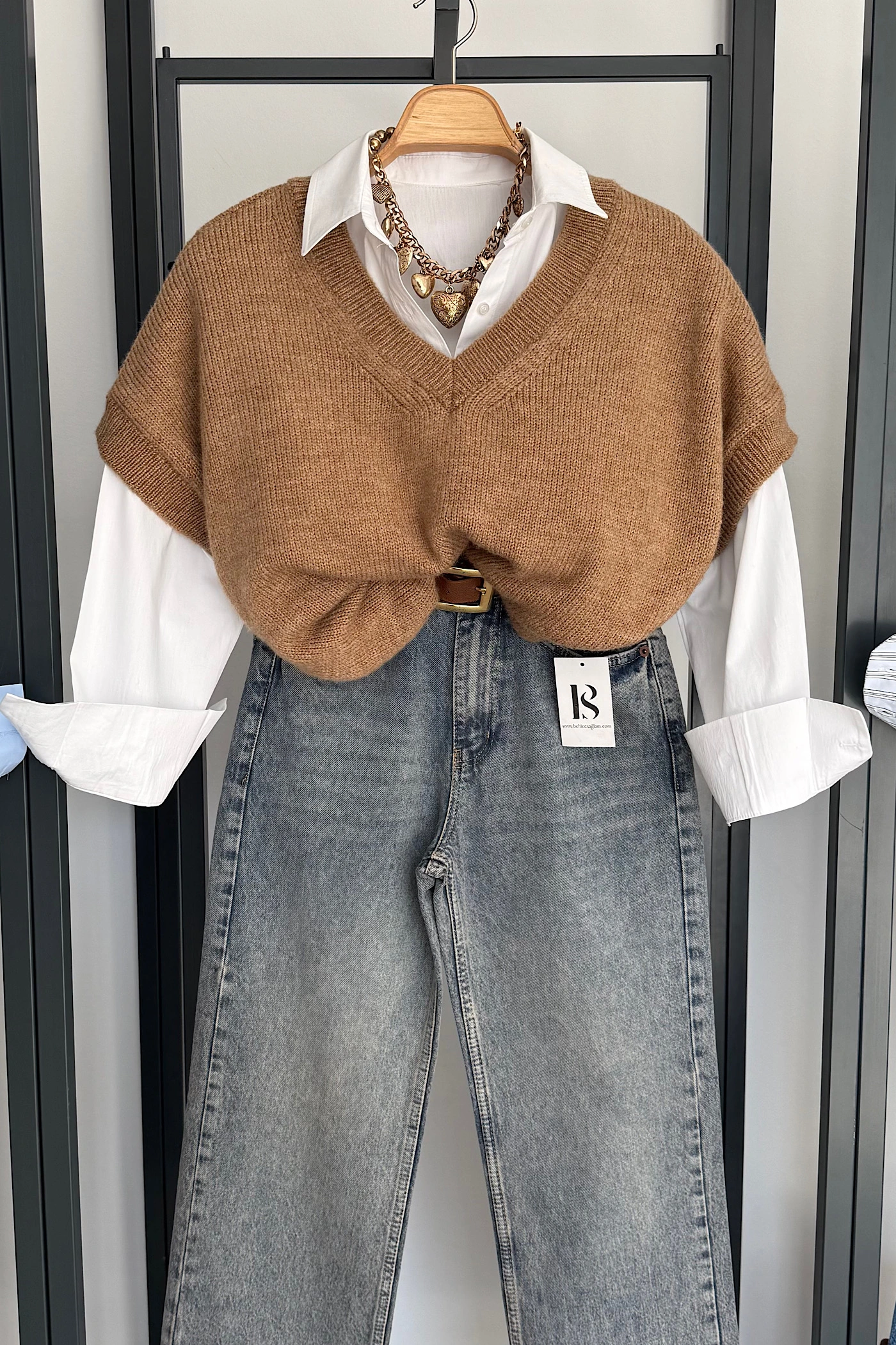 V-Neck Diamond Patterned Brushed Knit Cardigan Brown