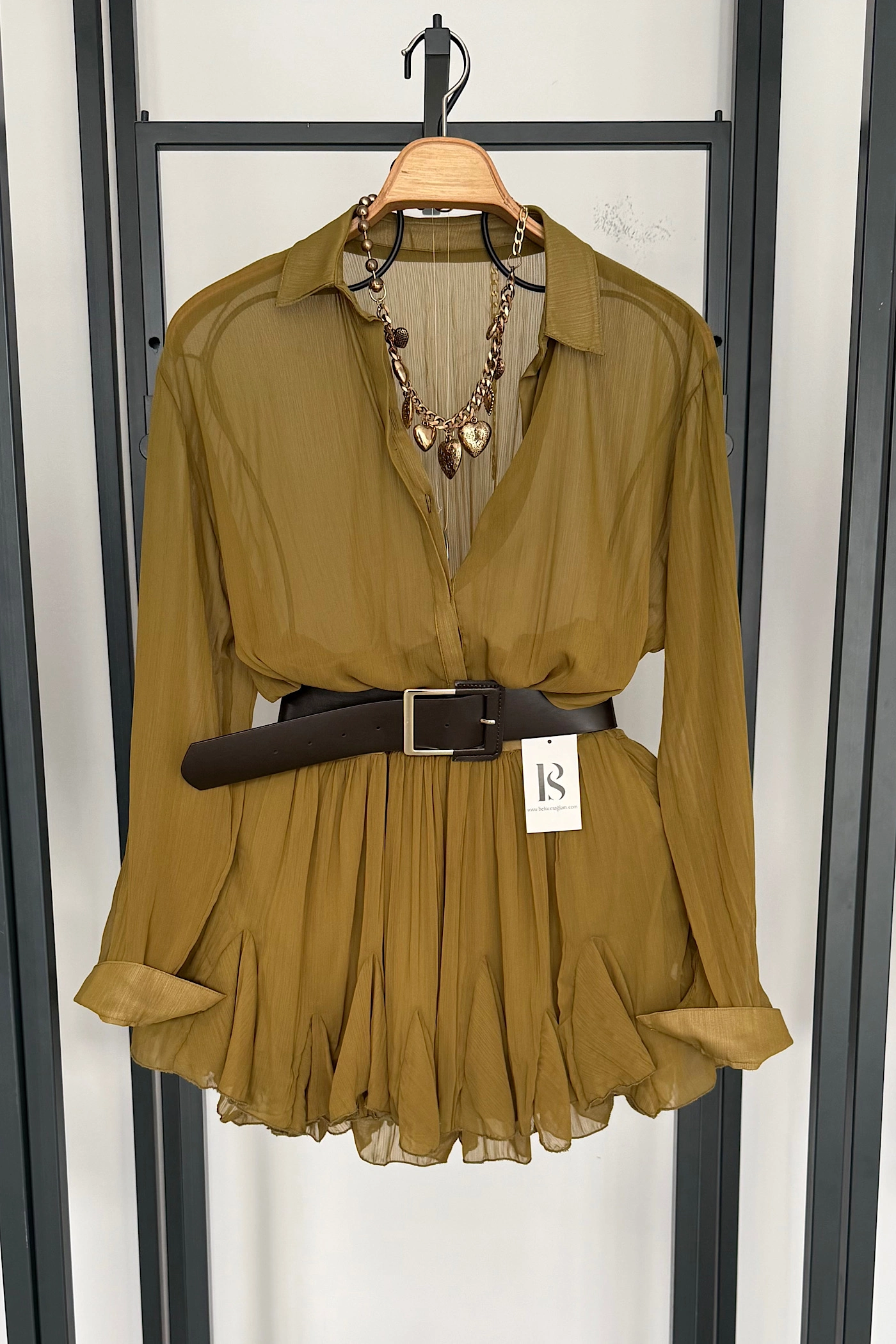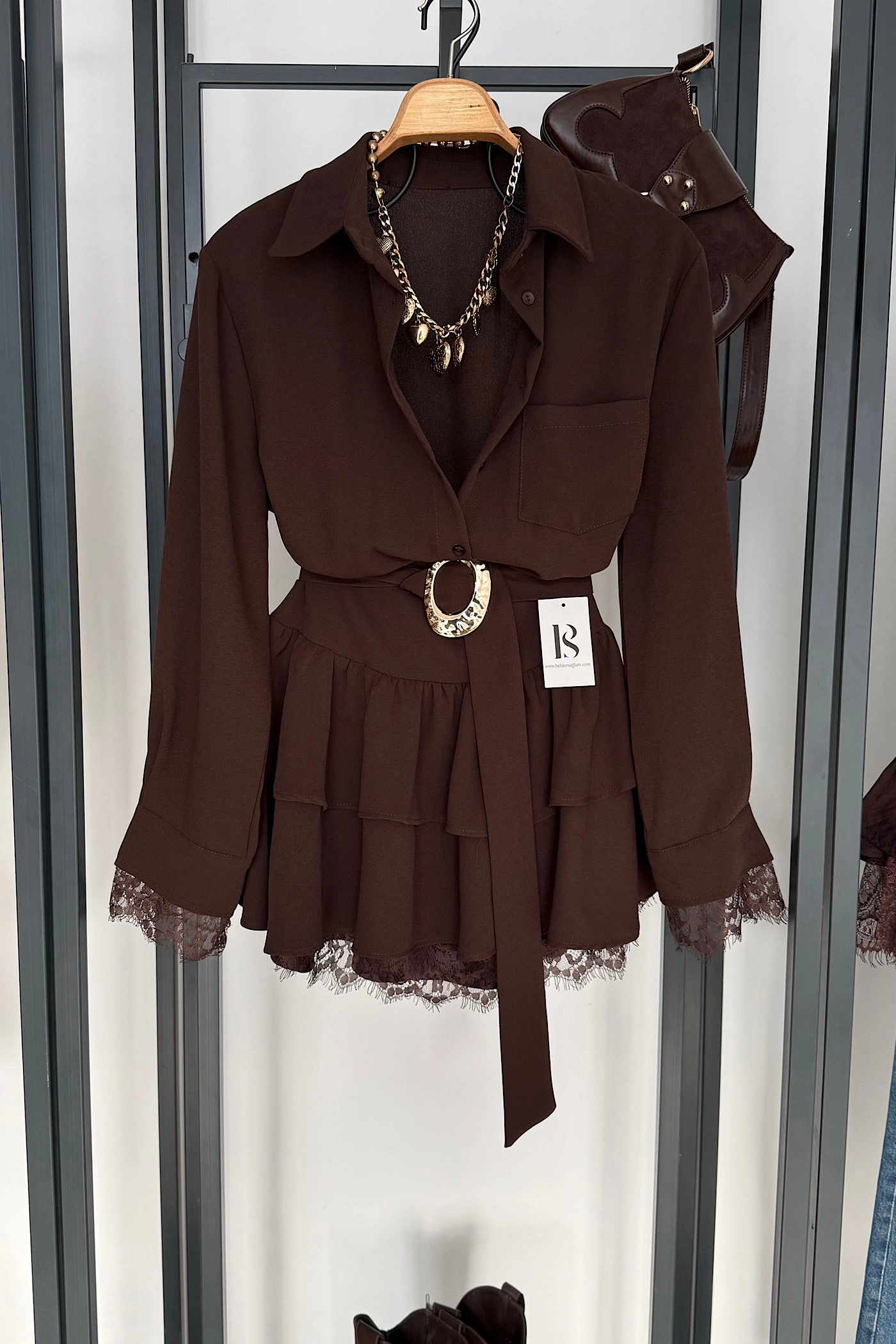 Gold Belted Lace-Detail Dress – Brown